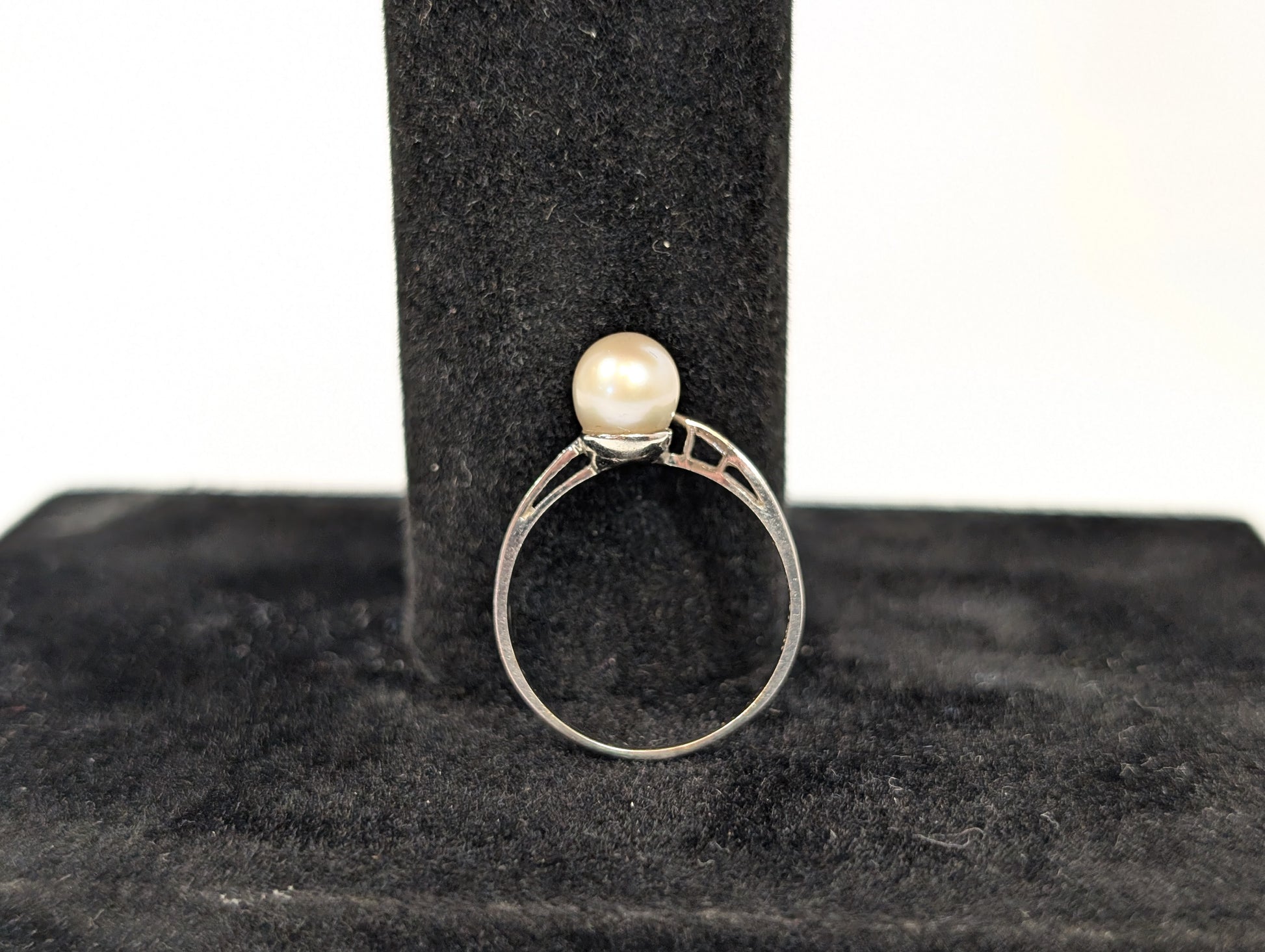 This listing is for the photographed Beautiful14KT White Gold Pearl Ring - Size 6. Beautiful 14KT white gold ring studded with a shimmering pearl. Stamped on the inside of the ring is "IMP 14K". Pearls are an extremely beautiful stone coming from oysters or mussels and are believed to symbolize purity, wisdom, and innocence.