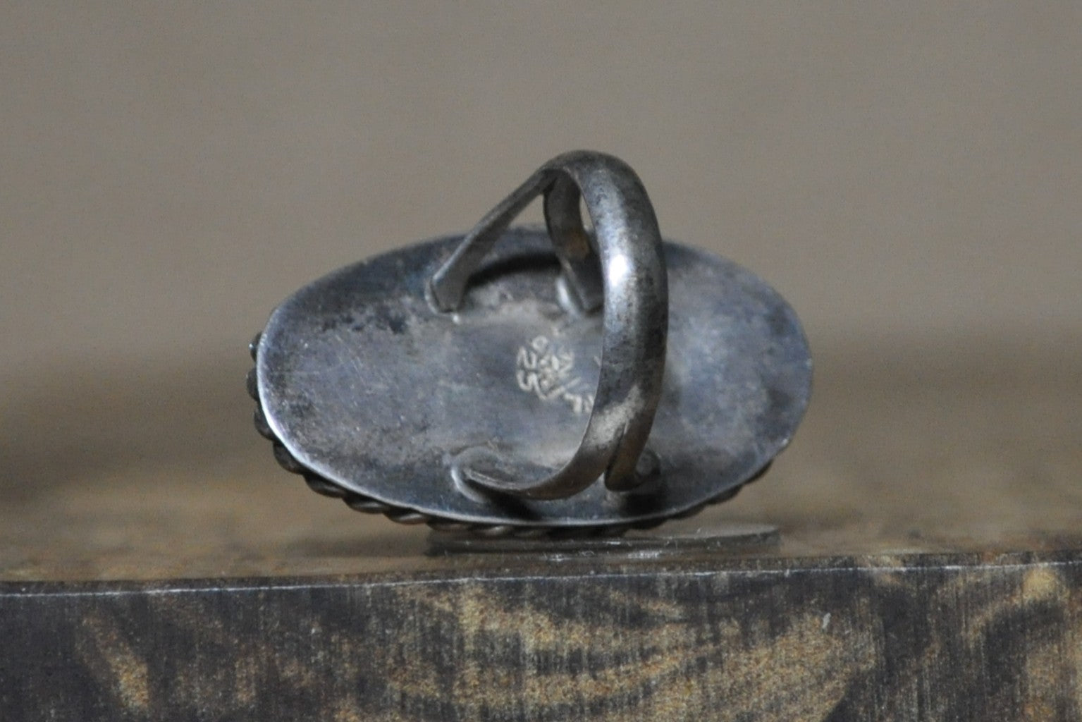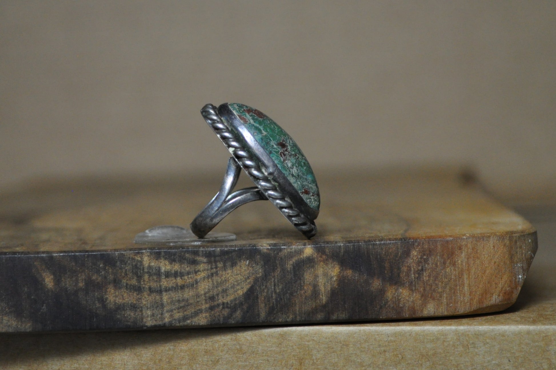 This listing is for the photographed Stunning Oval Cut Chrysocolla Twisted Rope Bezel Ring - Size 5.5. Beautiful sterling silver ring featuring an oval cut chrysocolla stone in a twisted rope bezel and stamped on the inside with "Sterling 925". Chrysocolla, linked to the Egyptian Goddess of Love Hathor, is also belieeved to promote peace, wise self-expression, and balancing the heart and throat chakras to encourage a person to communicate their truth with love. Large beautiful ring to spice up your jewelry collection!