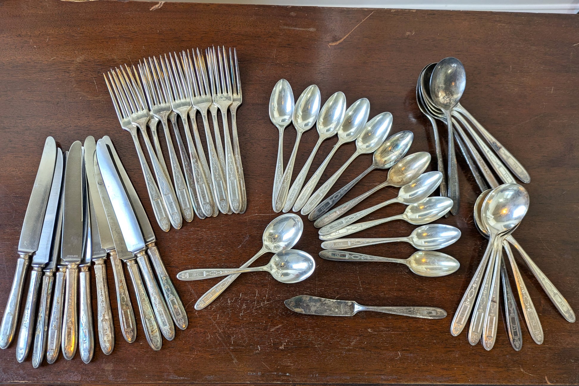 Grosvenor 1921 Oneida Community Plate Dinner Set - Stamped and Tested Silverplate - Knives, Forks, and Spoons - 48 pieces - Dinner Parties