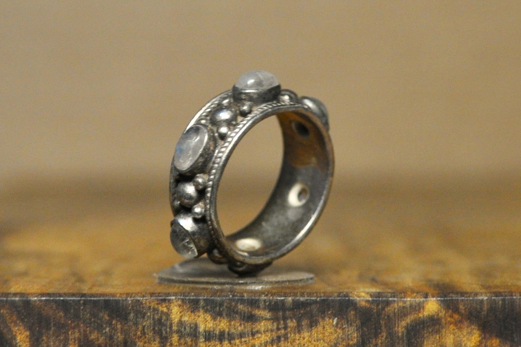 This listing is for the photographed Stunning Six Moonstones Silver Ring - Size 8. Beautiful sterling silver ring featuring six small oval cut moonstones adorning the ring with small soldered sterling silver designs in between each stone. Stamped on the inside of the ring is "925". Moonstone is believed to bestow healing properties to those using it, including having a strong connection to femineity. Amazing sterling silver moonstone ring to accentuate your ring wear!