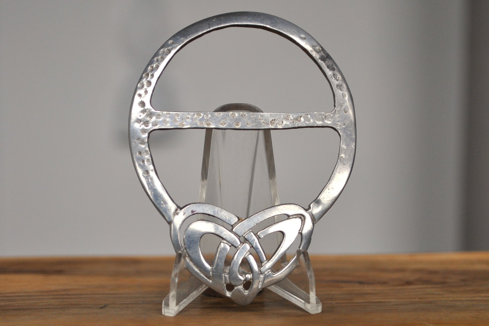 This listing is for the photographed Vintage Celtic Double Heart Pewter Scarf Ring. Intriguing Celtic scarf ring made of fine British pewter produced in Scotland. The pewter has been shaped to depict two hearts inside each other that also creates a trinity knot or triquetra. The triquetra, also known as the Trinity Knot, is an ancient symbol that takes the form of three interconnected arcs or loops. It's a three-cornered knot design and is often associated with Celtic and Christian cultures. The symbol has been interpreted in various ways, including representing the Holy Trinity, the interconnectedness of mind, body, and spirit, and the cyclical nature of life, death, and rebirth. Scarf rings are decorative and functional accessories that enhance the way you wear scarves. They're used to hold scarves in place, tie them, and add a touch of elegance to your outfit. Besides tying scarves around your neck, you can also use them to secure scarves as headbands or as self-belts on dresses and coats