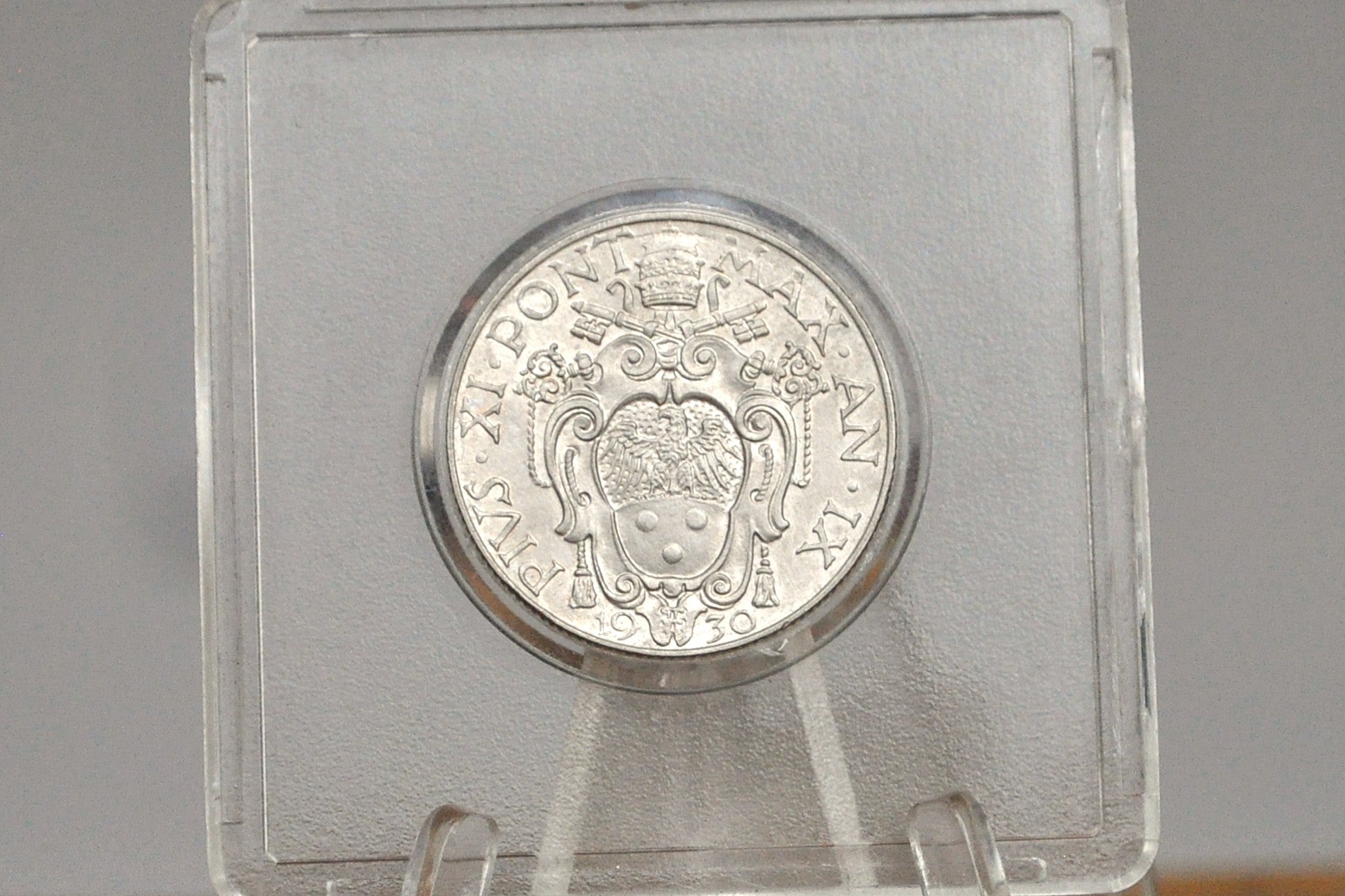 This listing is for the photographed 1930 Vatican City 50 Centesimi Coin. Featured on the front is St. Michael the Archangel sheathing his sword. On the other side is the crowned arms of Pope Pius XI along with the crossed keys of St. Peter and the Papal Crown.