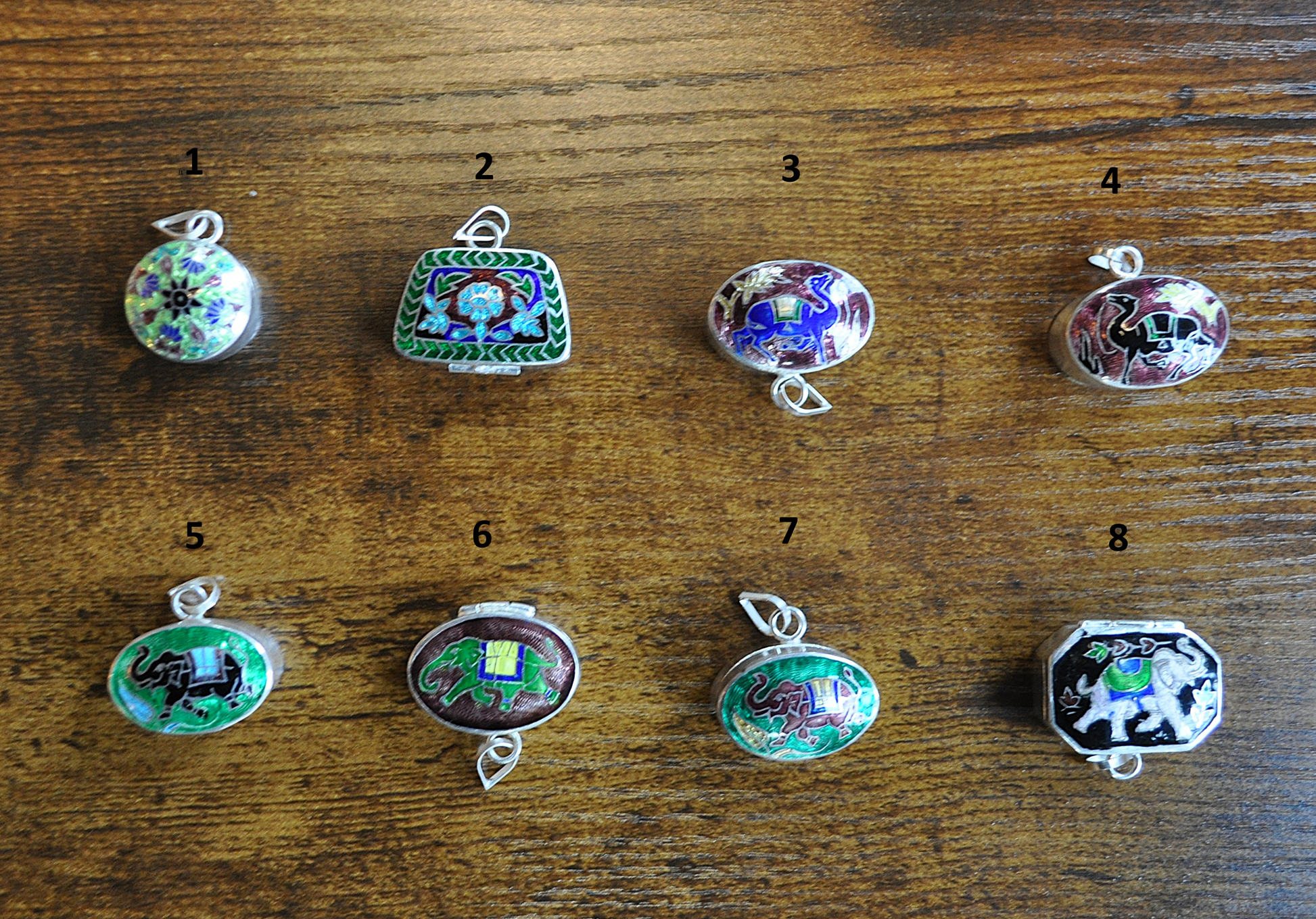 This listing is for 19 different handmade Indian pill boxes. Each Box is unique, and due to them being handmade, there are slight welding and painting imperfections. These are suspected to have been made around the 1940s. Each Box has been cleaned. The description below shows a full breakdown of each corresponding number with the production information.