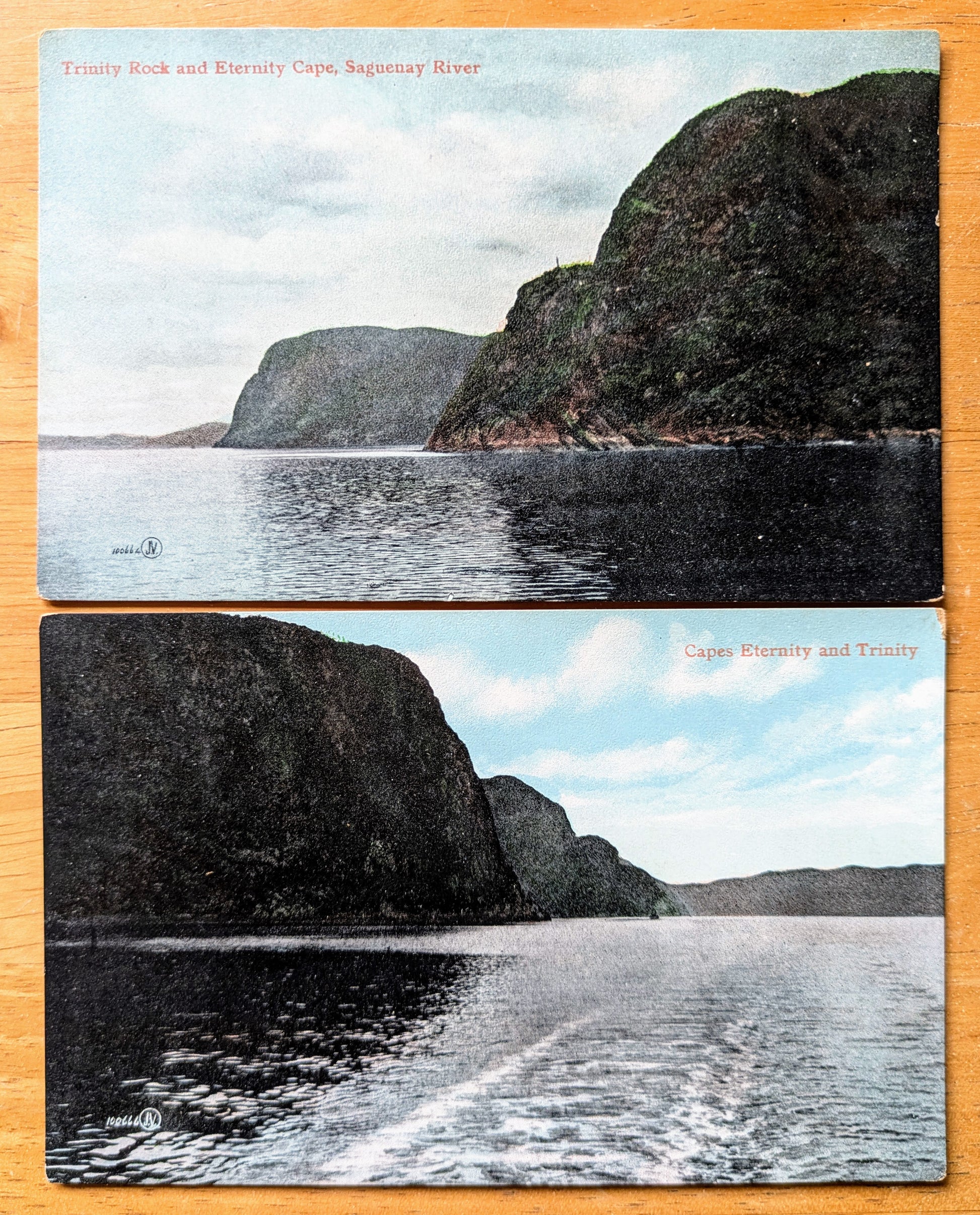 This listing features a Lot of 2 Antique 1900s Cape Eternity and Trinity Rock, Quebec, Canada Postcards. These postcards are unposted and blank, likely made before 1907 as identified by the undivided back. Both postcards show different colored lithograph views of Capes Eternity and Trinity on the Saguenay River in Quebec, Canada. One is titled "Trinity Rock and Eternity Cape, Saguenay River" and the other is titled "Capes Eternity and Trinity". The cards were published by the famous postcard publishers The Valentine & Sons Publishing Co. and printed in Great Britain. These postcards are unique because they show the scene on the front in color rather than black and white like other postcard scenes from this company! Perfect addition to any collection! Antique souvenir with a beautiful scene and colors!