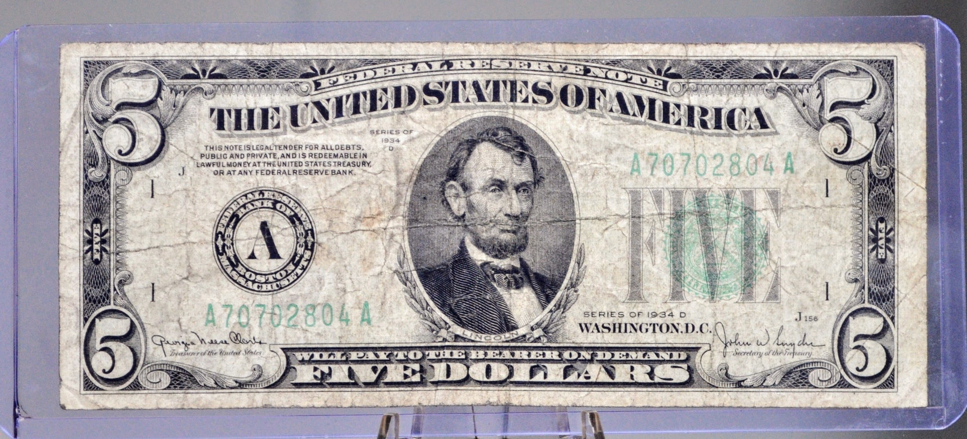 This listing is for one of the photographed 1934-A US 5 Dollar Federal Reserve Notes. Choose by Grade / Condition and Federal Reserve Bank Issue. Choice of Boston, MA (A), New York, NY (B), and Philadelphia, PA (C) Federal Reserve Bank issue notes. Signed by Julian and Morgenthau. Fr#1957-A, Fr#1957-B, and Fr#1957-C (Friedberg Number 1957-A, 1957-B, and 1957-C). Great additions to any collection!