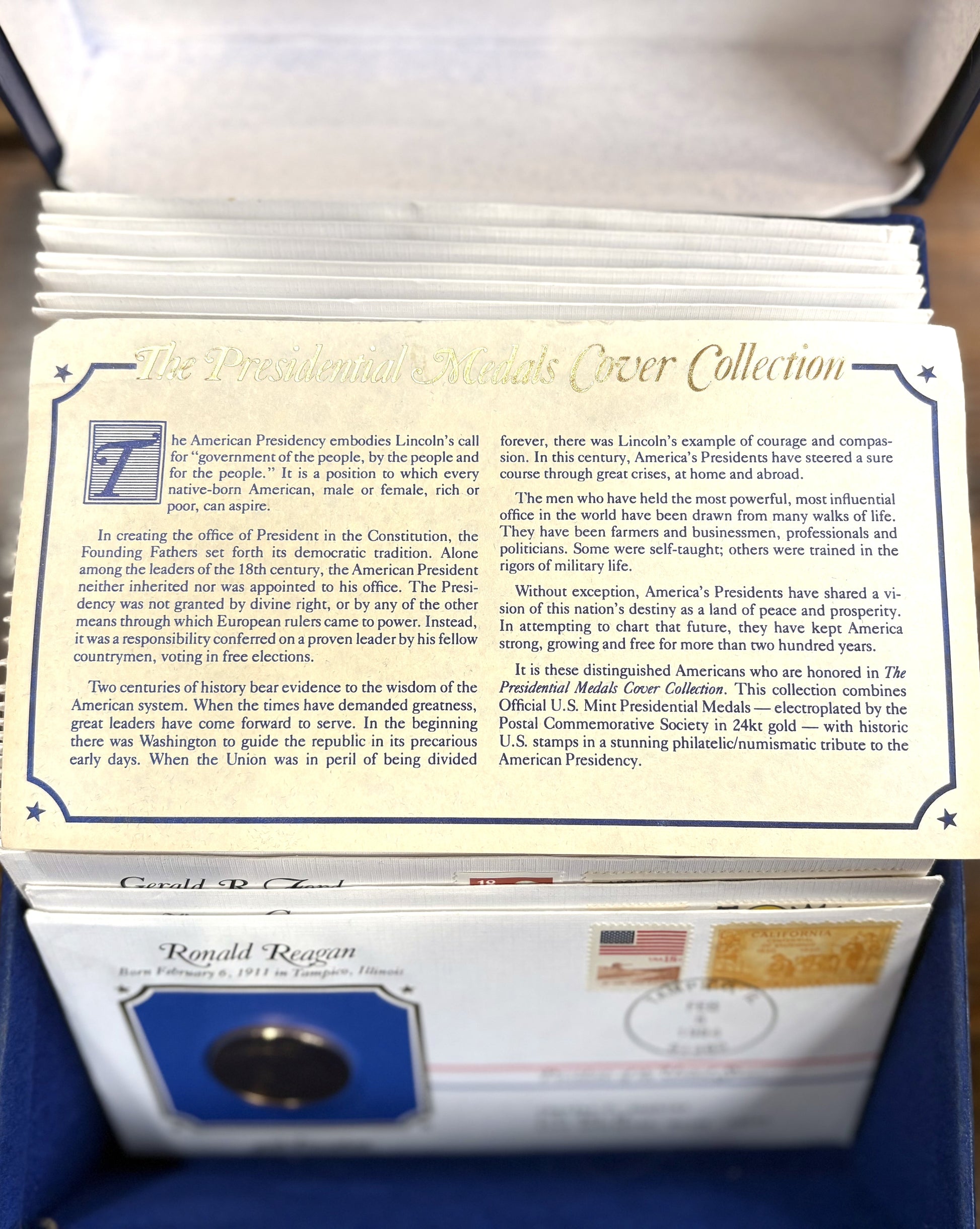 This listing is for The Presidential Medals Cover Collection 1-40 24k Gold Electroplated Set. The Presidential Medals Cover Collection is a set of historical mementos issued by the private company, the Postal Commemorative Society, primarily in the 1980s. Each item in the collection features an official medal produced by the U.S. Mint, which the society then electroplated in 24-karat gold. Each medal is housed in a philatelic envelope, known as a first-day cover, which bears one or more U.S. stamps relevant to that president, officially postmarked on the stamp's first day of issue. Great Find!!!