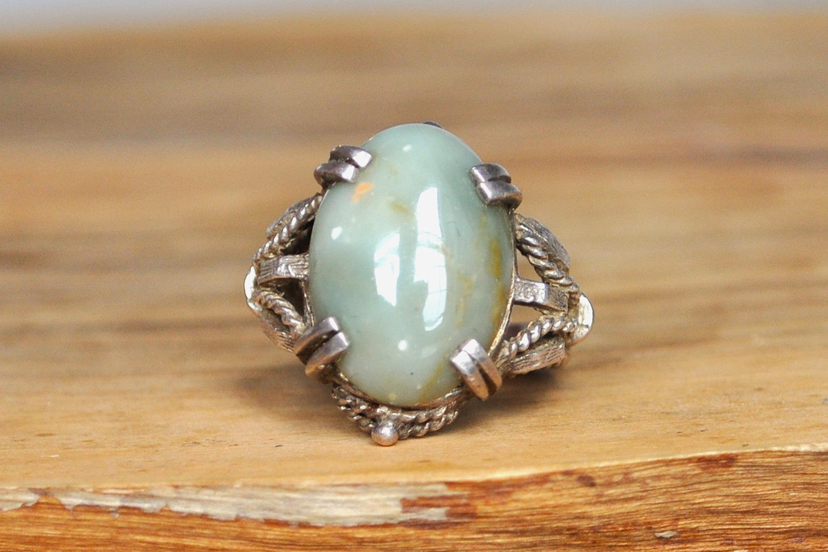 This listing is for the photographed Rare Sterling Silver Milky Jade Coiled Design Ring - Size 5. Really intriguing milky jade ring stamped sterling on the inside with a coiled design. Jade has a rich history in Chinese culture and jewelry as it is heavily related to the soul, heaven, and immortality. Jade is also used to symbolize the five virtues of Humanity: kindness, honesty, wisdom, courage, and modesty
