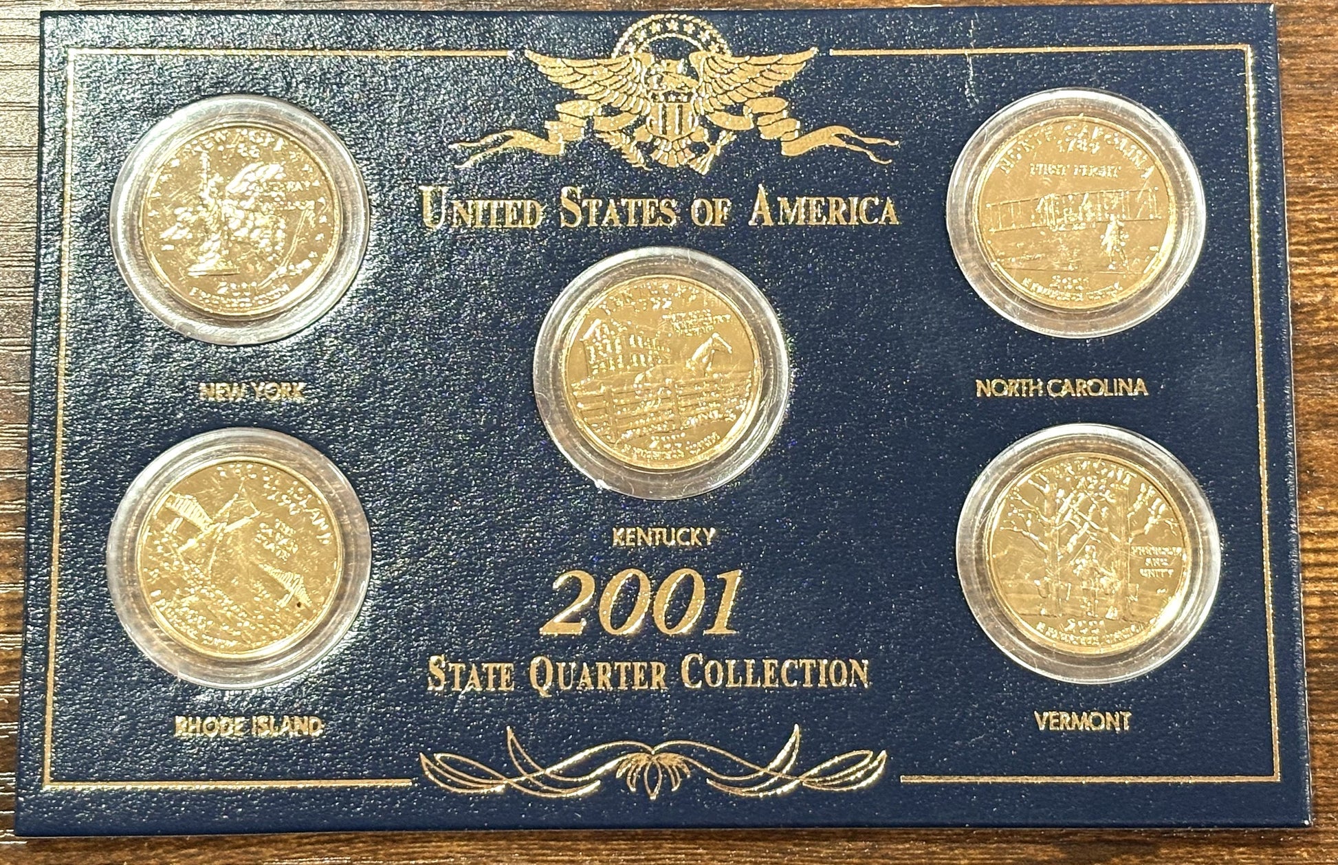 This listing is for the Five Quarter Set 24K Gold-Plated D and P Mint Mar. In this listing, you will receive one box with two coin sets inside for a total of 10 quarters. The set features quarters for New York, North Carolina, Kentucky, Rhode Island, and Vermont, which were the five states honored in the year 2001 program. The quarters are genuine U.S. Mint coins that have been layered with a thin layer of gold. Great Find!!!
