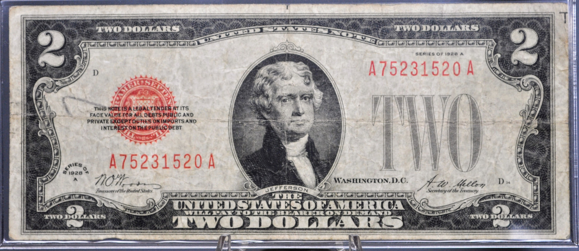 1928A Legal Tender 2 Dollar Rarer Series Note - F (Fine) Grade - A-A Block - 1928-A Two Dollar Red Seal Banknote - Fr#1502