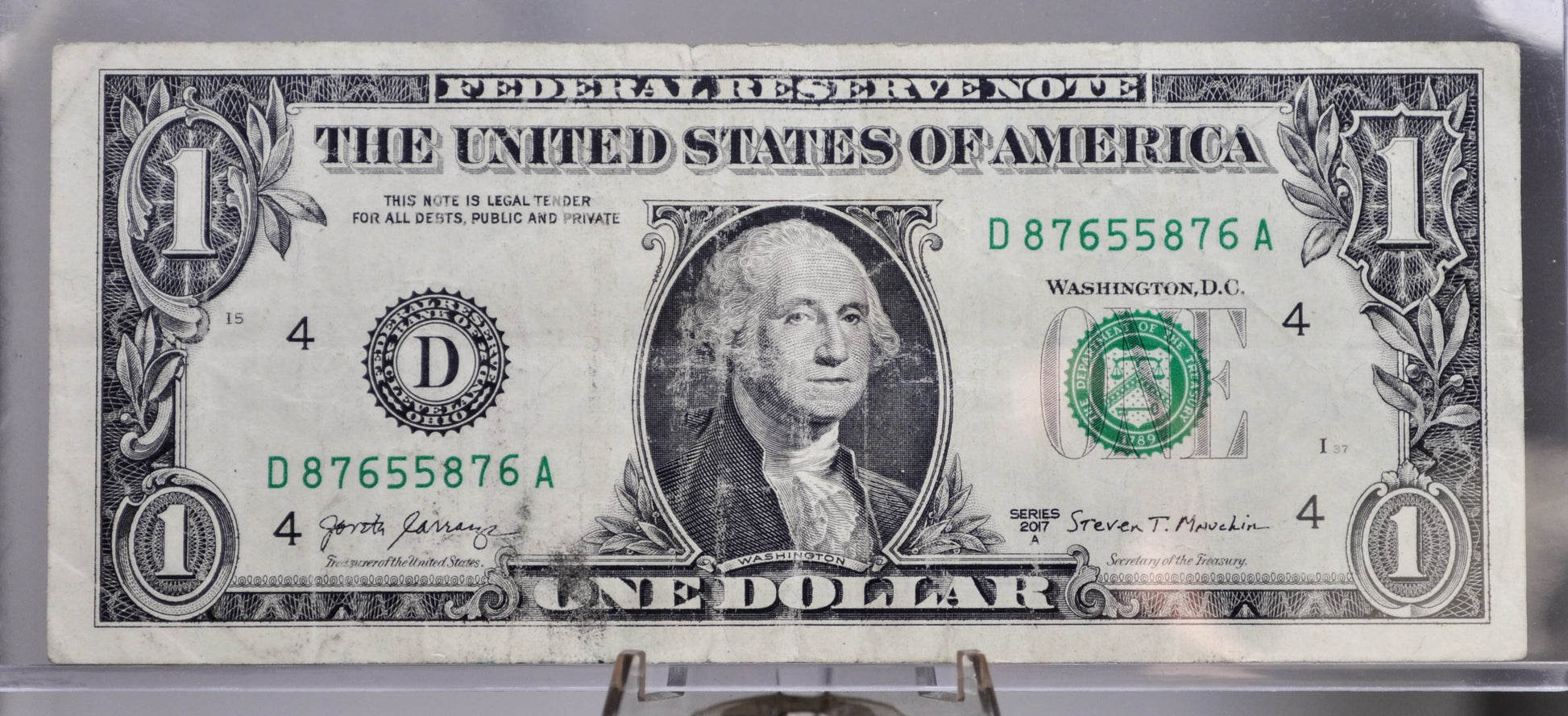 This listing is for the photographed 2017A Federal Reserve 1 Dollar Funky Serial Number Note. The serial number of this note is known as a radar, having the same 3 numbers at the notes start and end (87655876), making it a super cool and unique find! Issued at the Federal Reserve Bank in Cleveland, Ohio, "D" issue. Very Fine (VF) grade/condition, some visible folds and other signs of circulation. Amazing find and a must have for any collection! Fr#3006-D (Friedburg Number 3006-D).