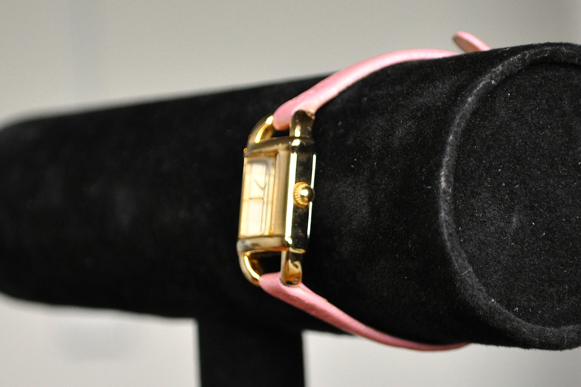This listing is for the photographed Beautiful Gold Tone Timex Analog Watch. This beautiful analog watch made by Timex features a rectangular gold tone dial with a pink floral designed genuine leather band. Working watch with a new battery and has been tuned to EST.