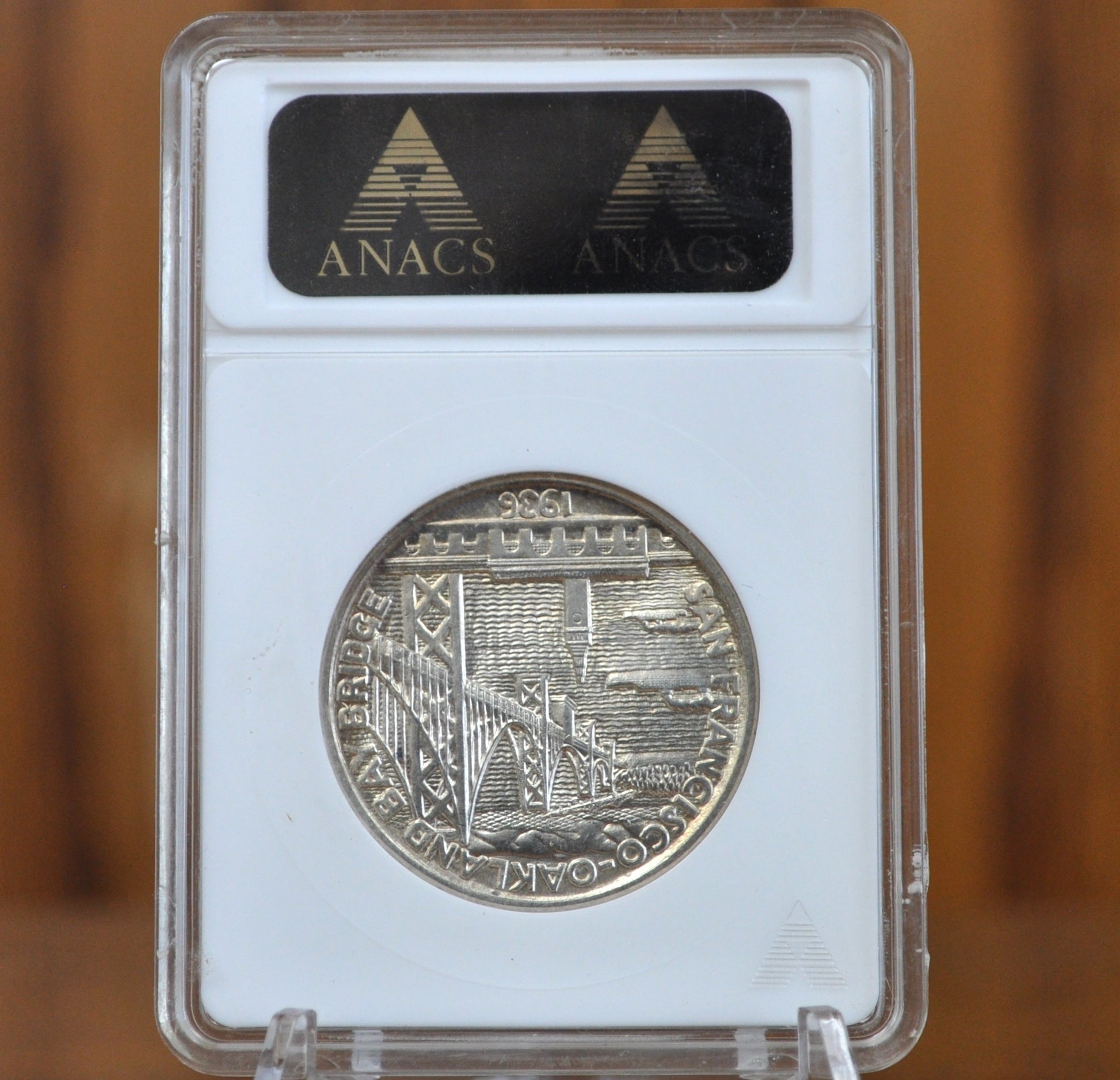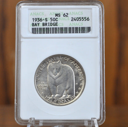 Only 71,424 of these 1936-S Bay Bridge / San Francisco Commemoratives were minted. ANACS slabbed and graded MS62.