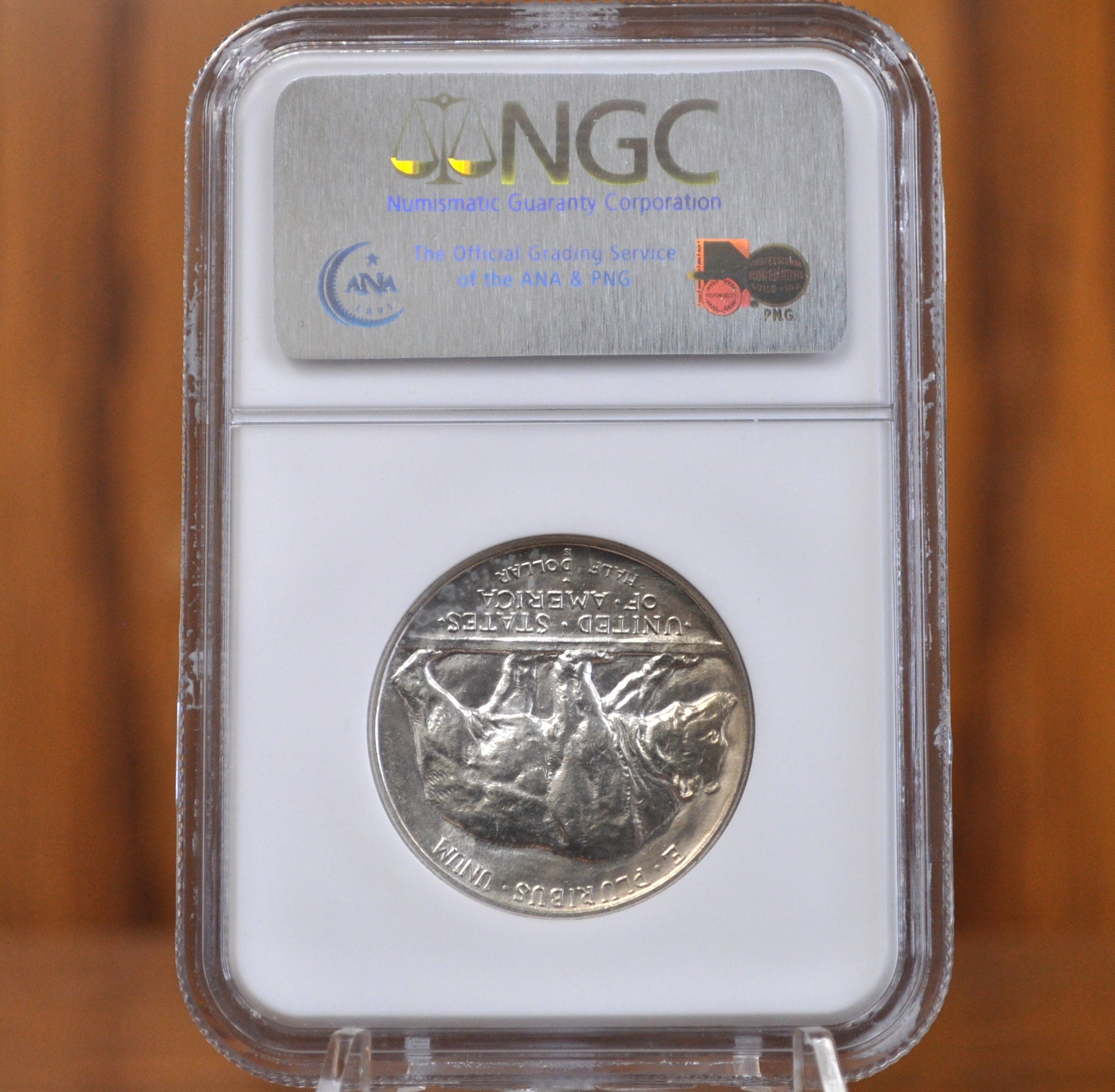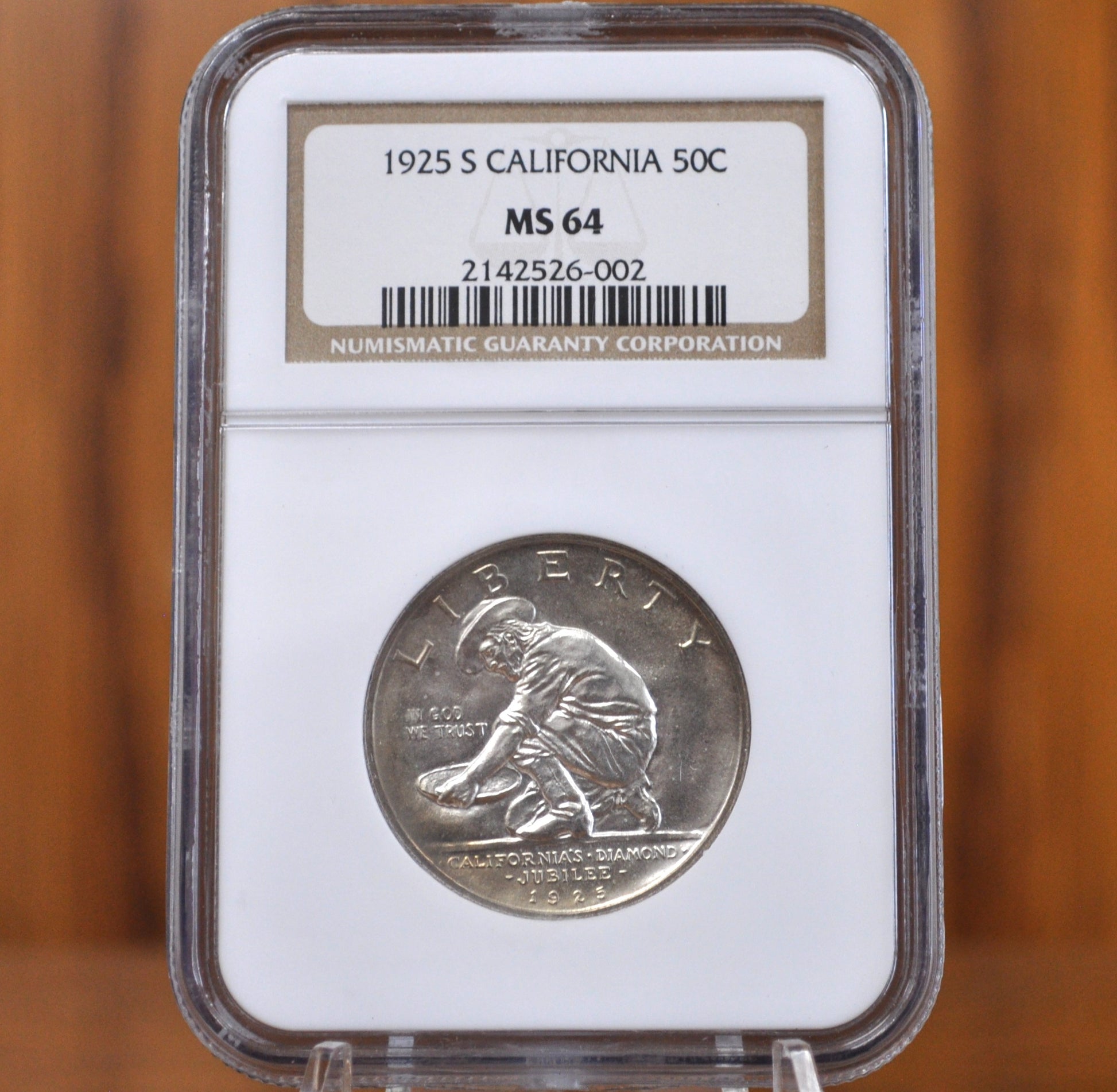 Only 86,594 of these 1925-S California Diamond Jubilee Commemoratives were minted. NGC slabbed and graded MS64.