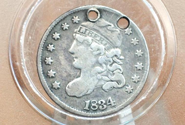 1834 Capped Bust Half Dime - VF Details, Holed - 1834 Silver Capped Bust 5 Cent - Early American Coin, 1834 Half Dime
