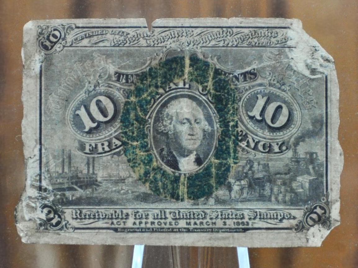 This listing is for the photographed 1863 Second Issue 10 Cent Fractional Note. Very faint surcharge "18-63" on the reverse of this note. Very circulated, Good (G) grade/condition, with corner and margin tears from age. This note is 161 years old this year! Fr#1245 (Friedburg Number 1245).