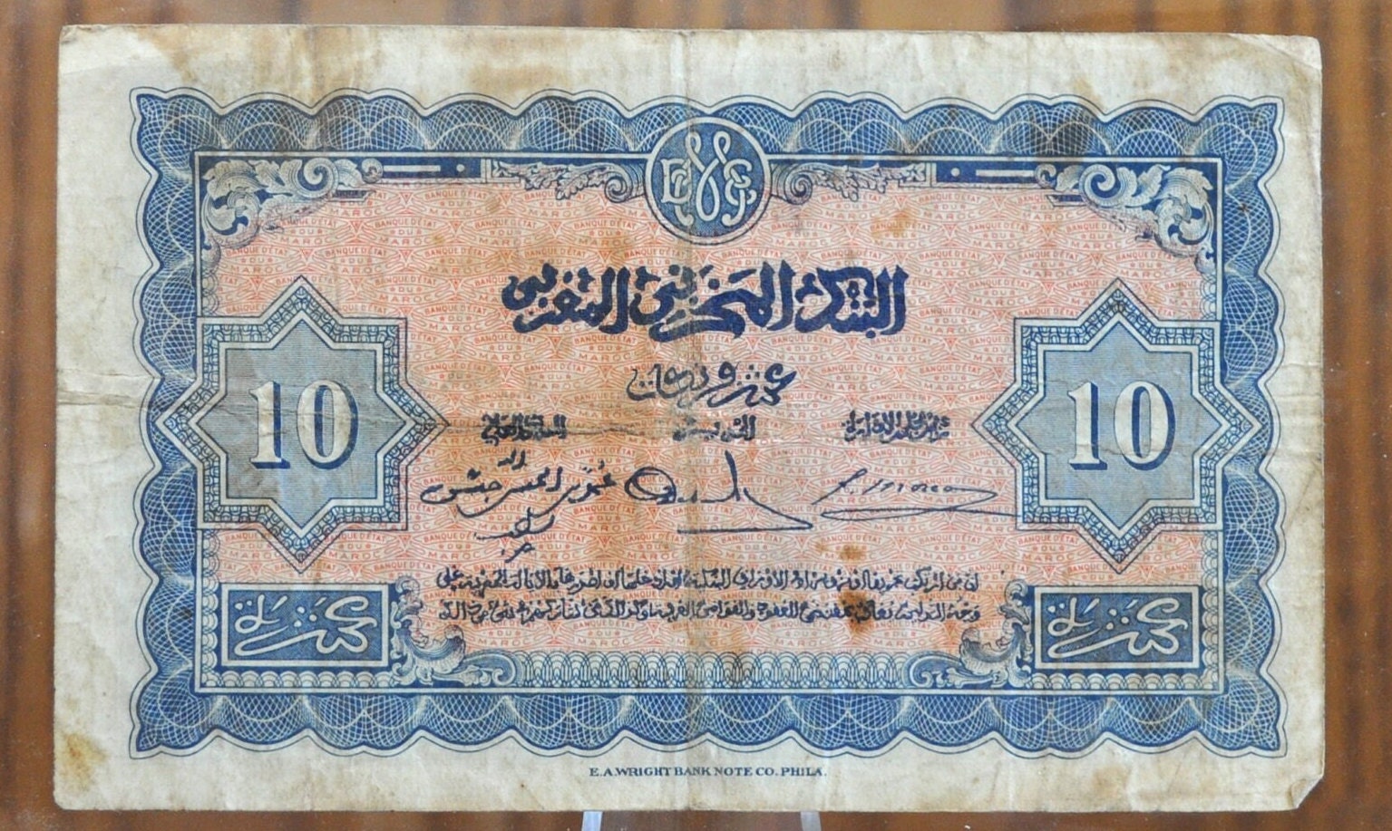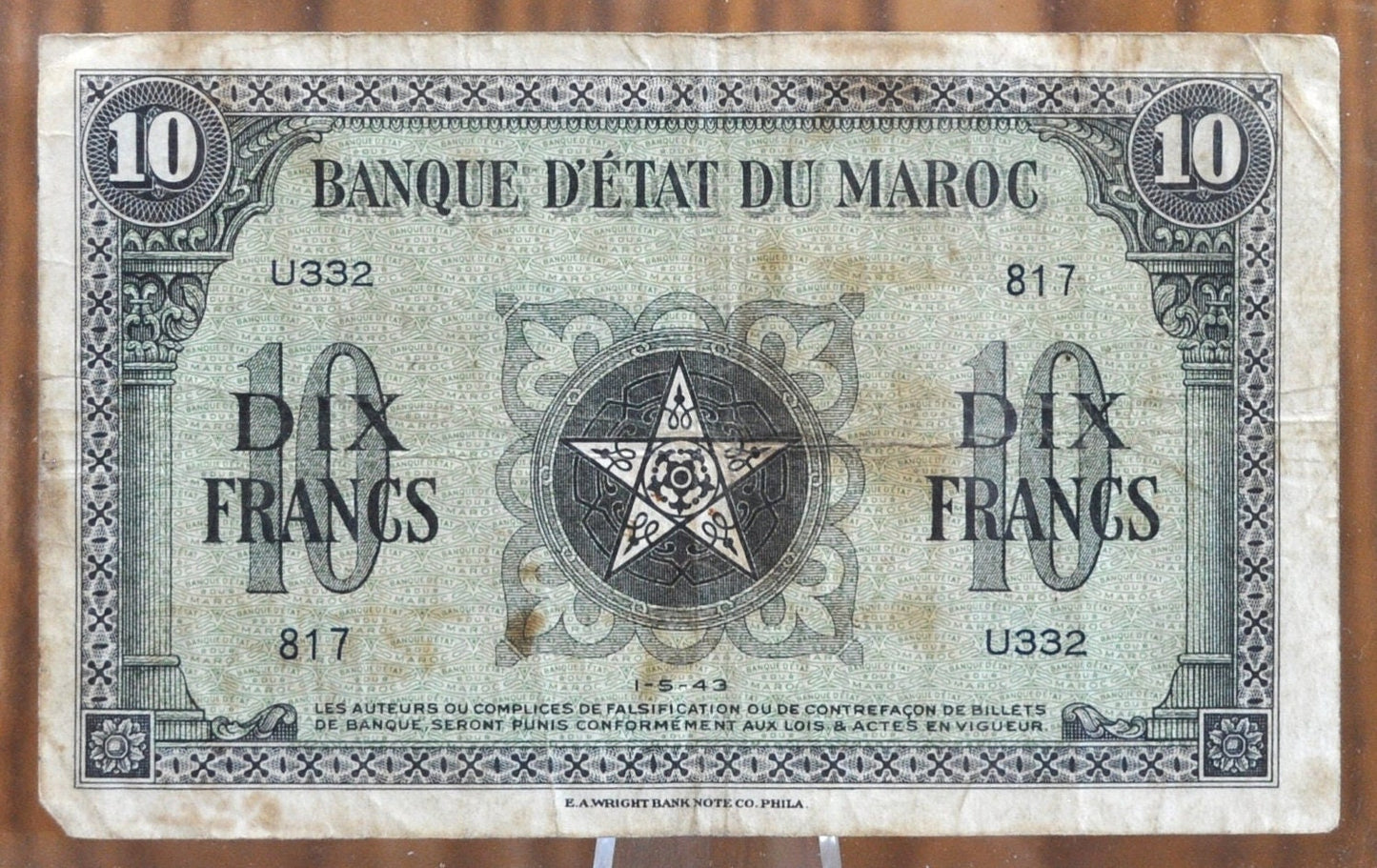 1943 Bank of Morocco 10 Francs Banknote - WWII Era Banknote - 1-5-43 Date - 1943 Banque Detat Du Maroc Dix Ten Franc Note - P#25a