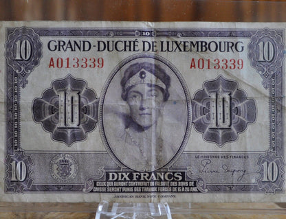 This listing is for the photographed 1944 Grand Duché De Luxembourg Dix Francs Paper Note. Very well preserved 10 Franc Banknote from 1944 (the final period of WWII). The note pictured is the exact one you'll receive.