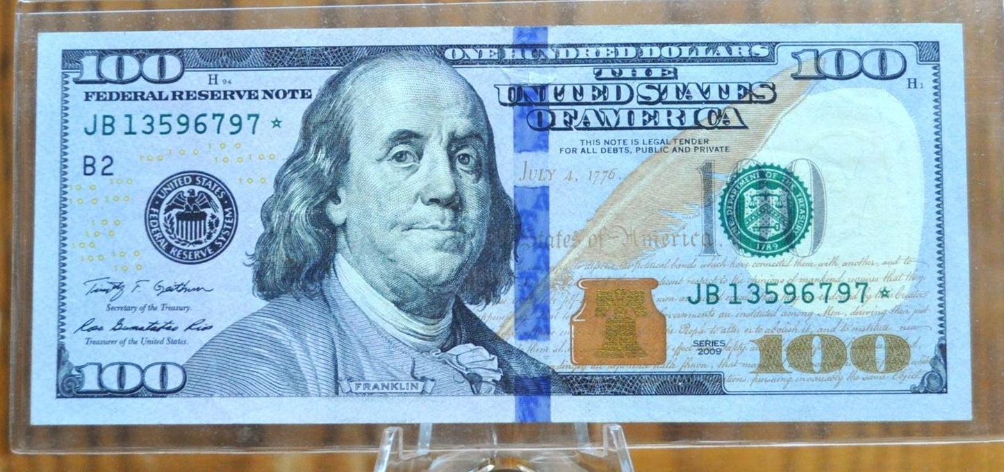 This listing is for the photographed 2009 100 Dollar Federal Reserve Star Note. This note was issued in New York, as depicted by the "JB" prefix. This note was from the first 2009 series, differentiating it from the 2009A series. It is also a star replacement note making it an even rarer piece. Must have for any collection. Very cool note. Fr.2184-B* (Friedburg 2184-B*).
