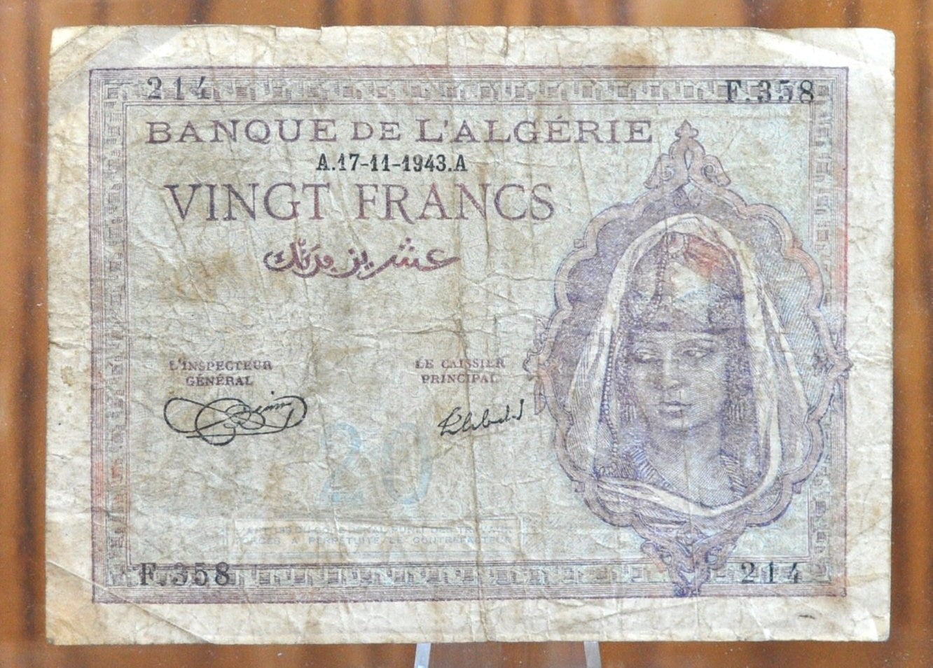 This listing is for the photographed 20 Franc Banknote from 1943. Bank of Algeria under French monetary policy. Fantastic piece of history.