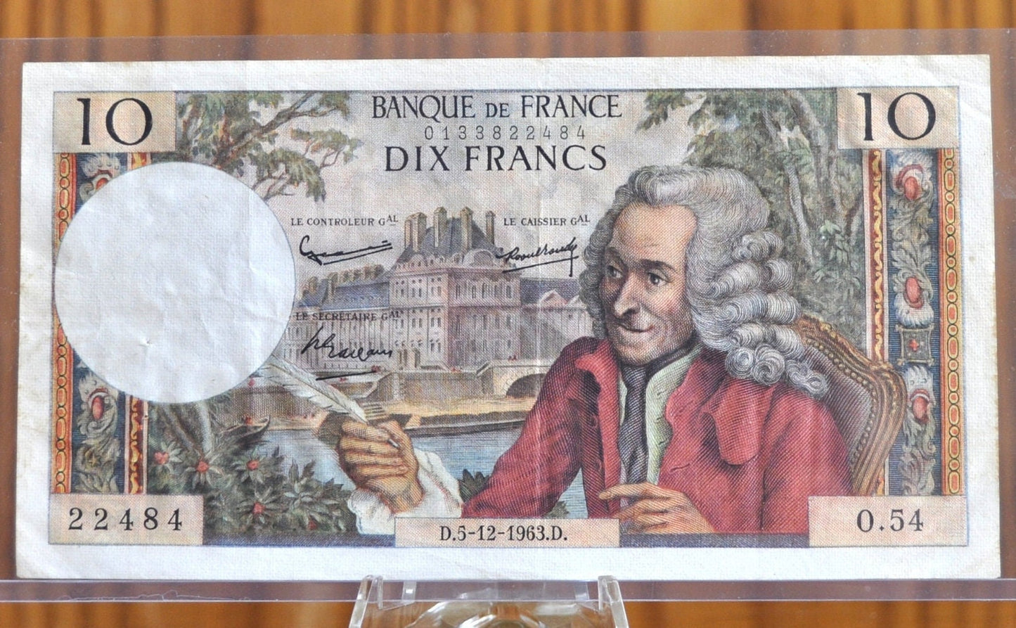 1963 France 10 Franc Banknote - Voltaire Type - Pick Number 147a (P#147a) - French Ten Francs Banknote 1963 5-12-1963