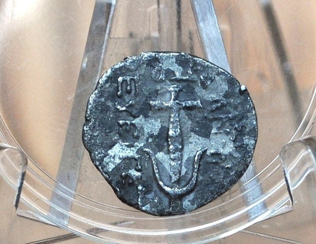 Jerusalem mint, 132 - 130 B.C.; obverse lily on stem with two leaves, dot border; reverse BAΣIΛEΩΣ ANTIOXOY EYEPΓETOY (Greek: of King Antiochus, Benefactor), anchor (Seleukid symbol) upside down, AΠP or BΠP (Greek: year 181 or 182 of the Seleucid Era) below (off flan)
