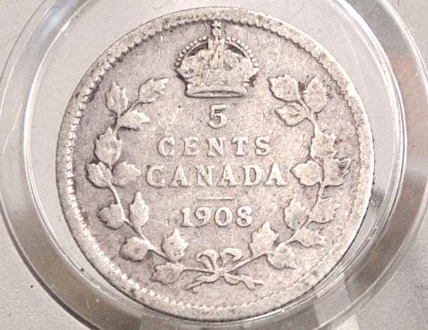 1908 Canadian Silver Dime - Fine Grade/Condition - Better Year - King George - 92.5% Silver 5 Cent Canada 1908 -