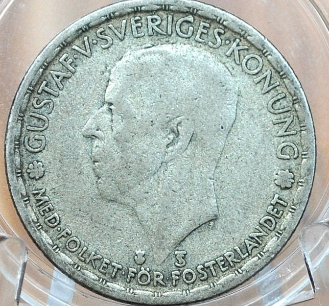 Struck in silver during the reign of King Gustav V of Sweden, this coin represents a piece of Swedish numismatic history. The design is classic and emblematic of mid-20th century Swedish coinage.