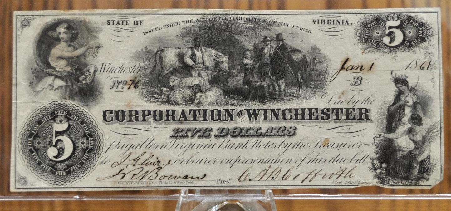 The town of Winchester, Virginia was established in 1752, making it one of the earliest towns within the Commonwealth of Virginia. During the Civil War, Winchester changed between Union and Confederate occupation approximately 70 times in total. Two Civil War battles took place within the city. In 1859 the city created a council for the corporation, which became responsible for the issuance of banknotes at the beginning of 1860. The corporation had three different printers responsible for creating their banknotes, resulting in a variety of different designs for the same denomination of banknotes. Excellent piece of history!