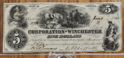 1861 Corporation of Winchester 5 Dollar Obsolete Note - XF (Extremely Fine) - Virginia Obsolete Currency - 1861 Winchester Five Dollars Note