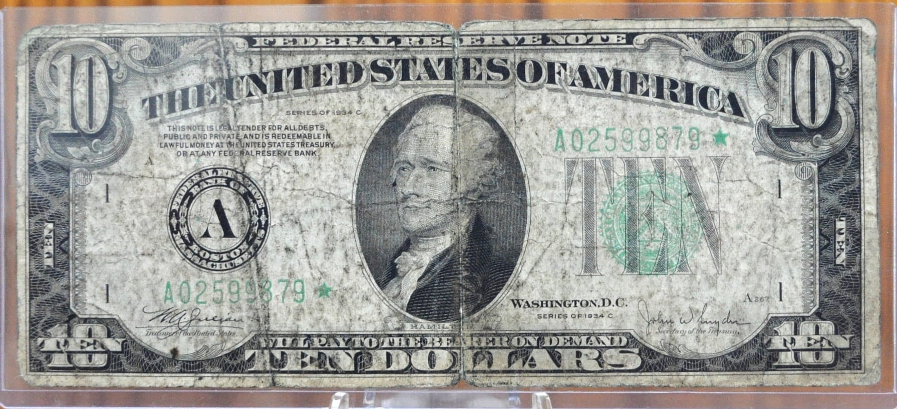 This listing is for the photographed 1934C Star Note 10 Dollar Federal Reserve Note - VG Grade / Condition. Boston issue. Fr#2008-A*.