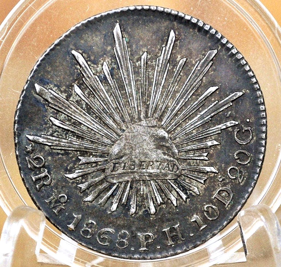 1868 Silver 2 Reales Mo PH Mexico - XF (Extremely Fine) Grade / Condition - Mexican Two Reales 1868 Silver Mexican Coin, 90% Silver, MO P.H.