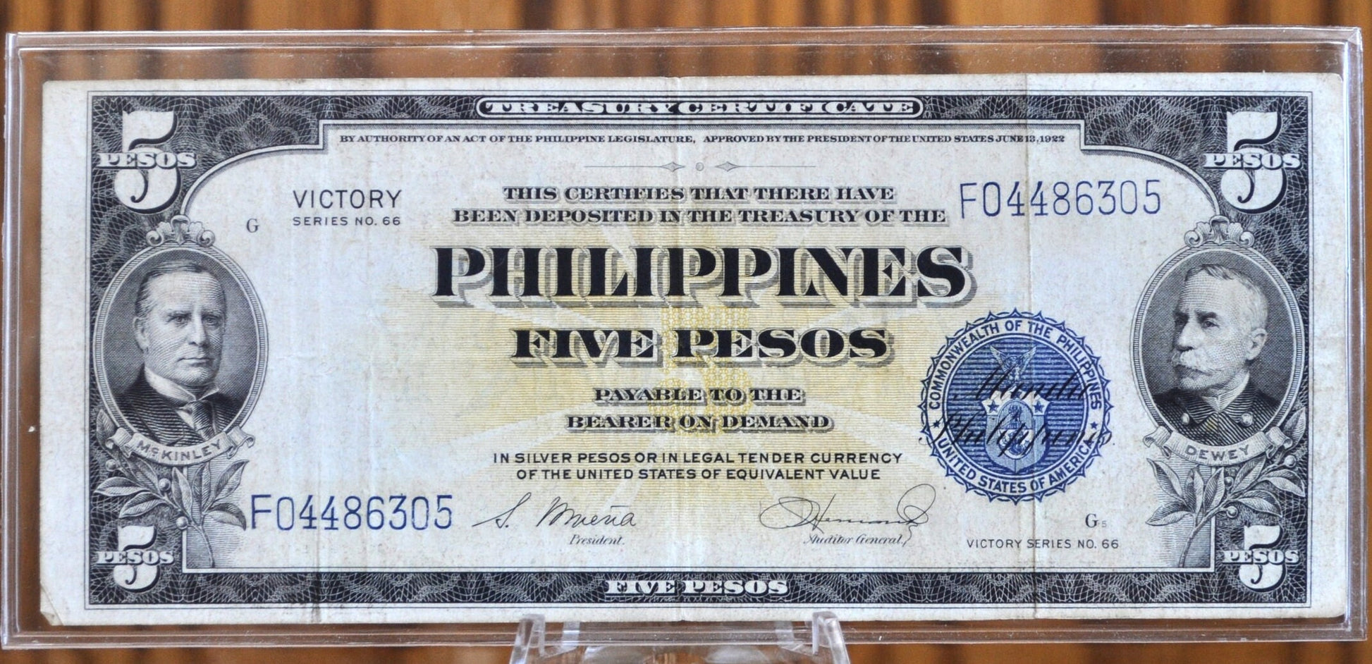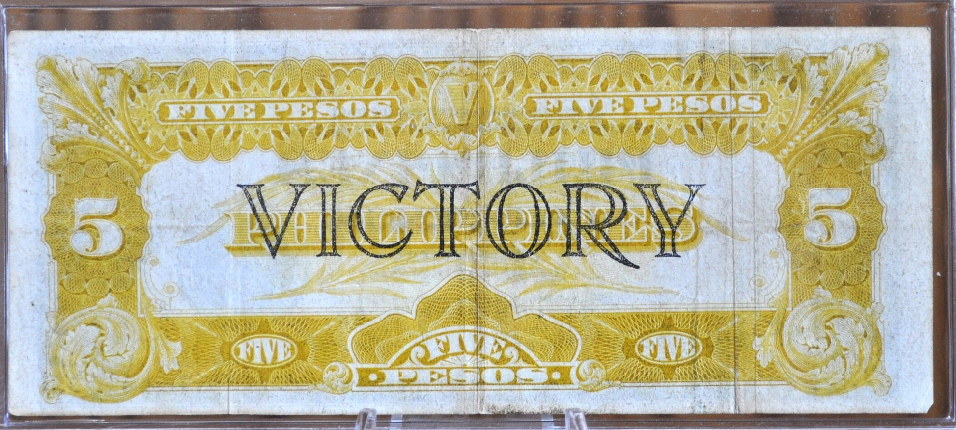 This listing is for the photographed 1944 Philippines 5 Pesos Victory Treasury Certificate. World War II Victory Series, issued by Commonwealth of the Philippines in 1944. P# 96a (Pick Number 96a).