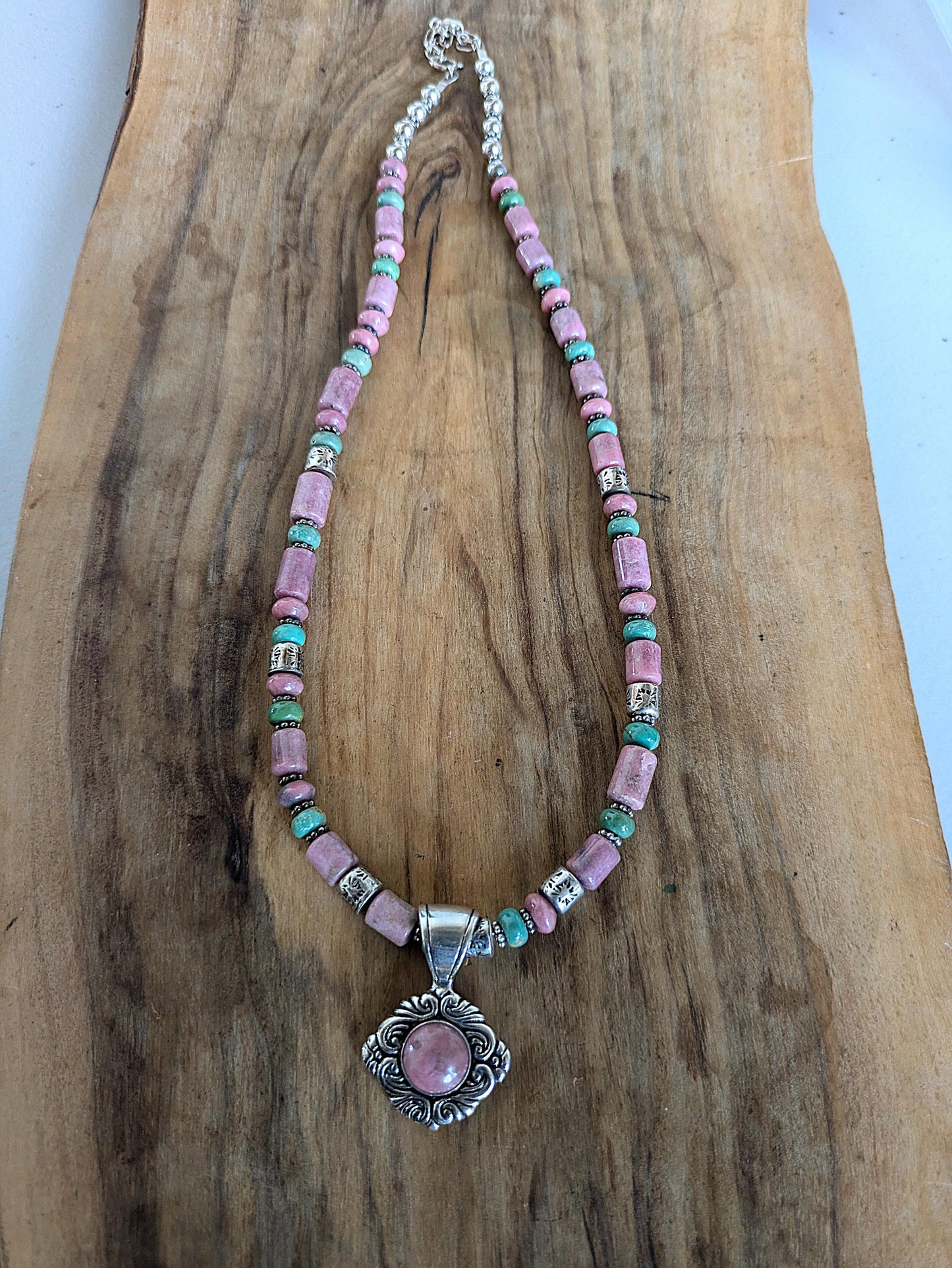 Vintage Carolyn Pollack Sterling Silver Southwestern Rhodonite and Turquoise Beaded Necklace - 17-19 Inches Adjustable